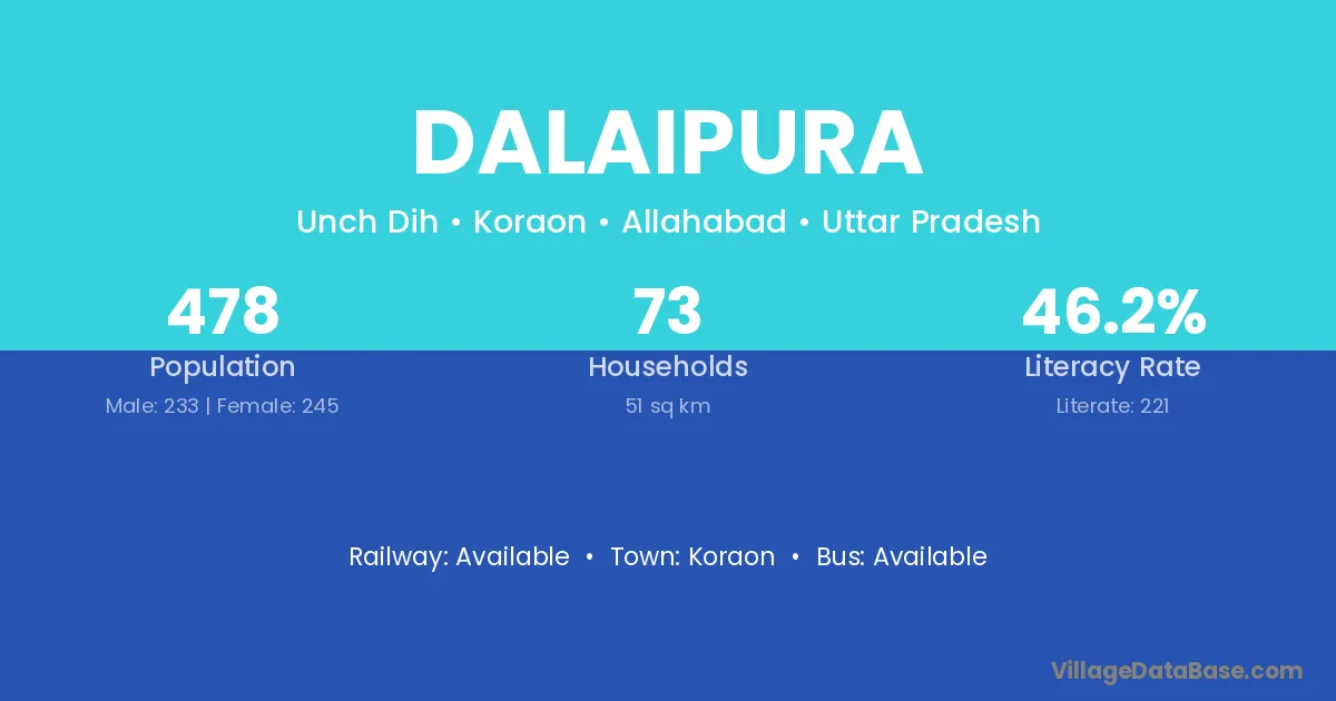Dalaipura village has a total population of 478 people, of which 233 are males and 245 are females.