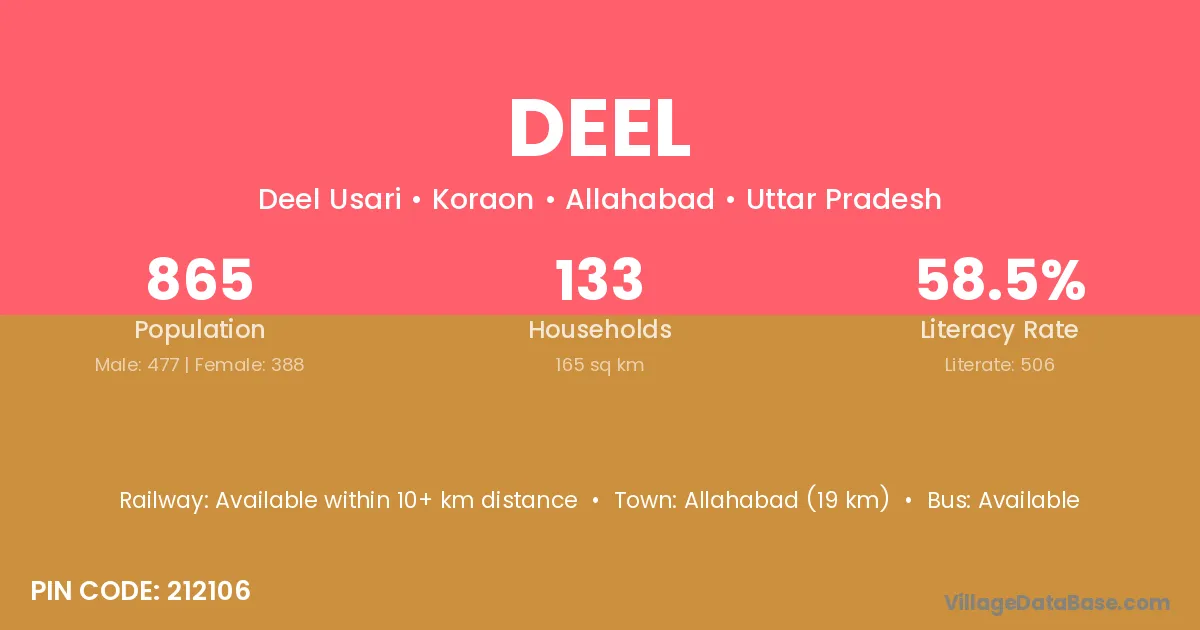 Allahabad (19 km) is the nearest town to Deel village for major economic activities and is located approximately 19 km away.