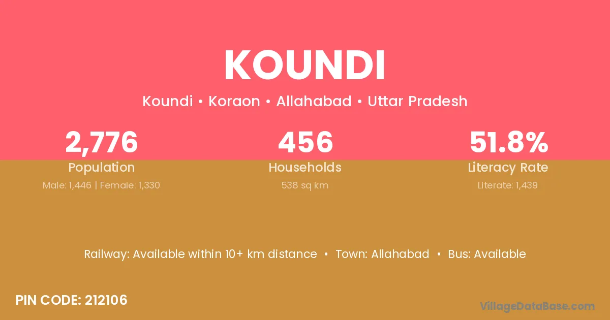 Koundi village has a total population of 2,776 people, of which 1,446 are males and 1,330 are females.