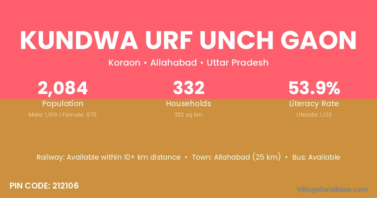 Allahabad (25 km) is the nearest town to Kundwa Urf Unch Gaon village for major economic activities and is located approximately 25 km away.