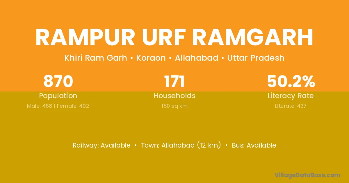 Allahabad (12 km) is the nearest town to Rampur Urf Ramgarh village for major economic activities and is located approximately 12 km away.