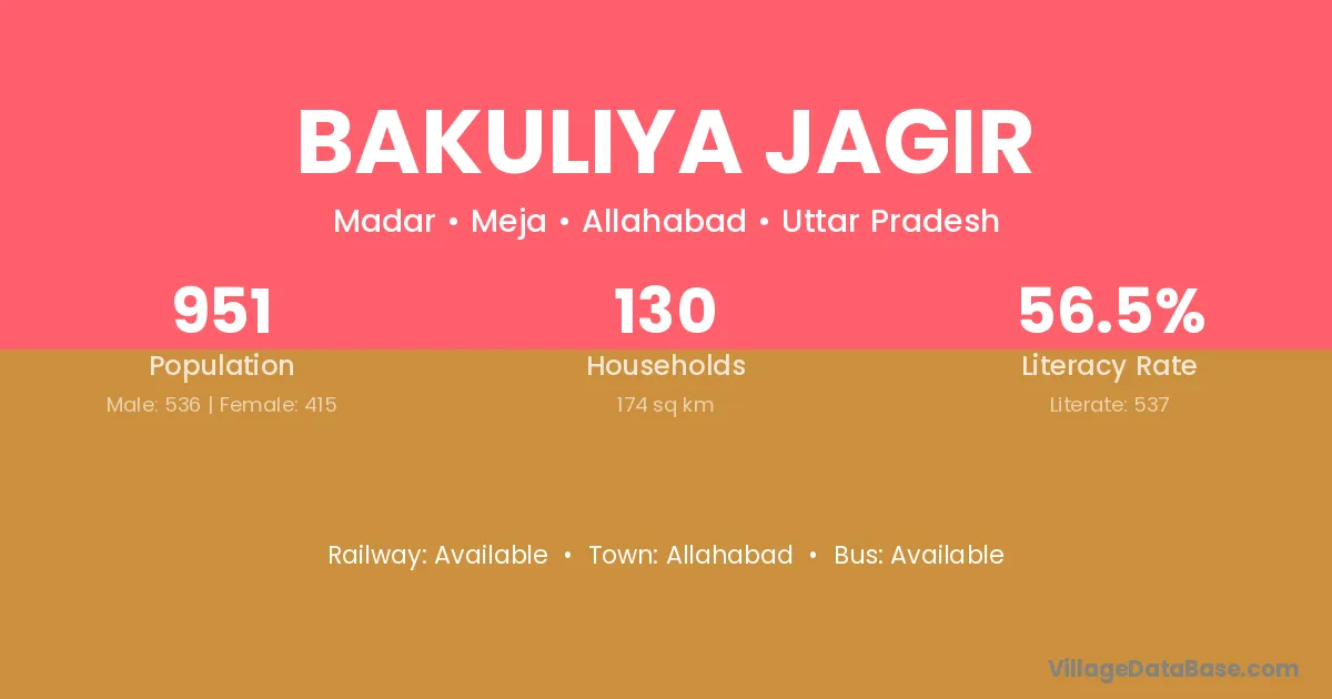 Bakuliya Jagir village has a total population of 951 people, of which 536 are males and 415 are females.