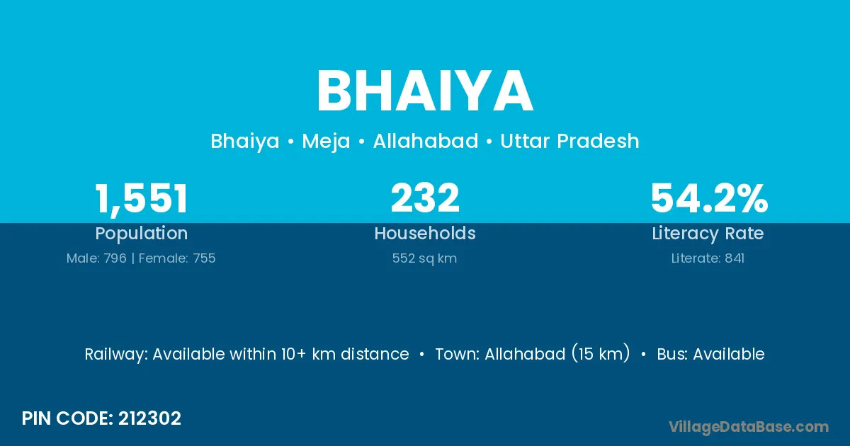 Allahabad (15 km) is the nearest town to Bhaiya village for major economic activities and is located approximately 15 km away.