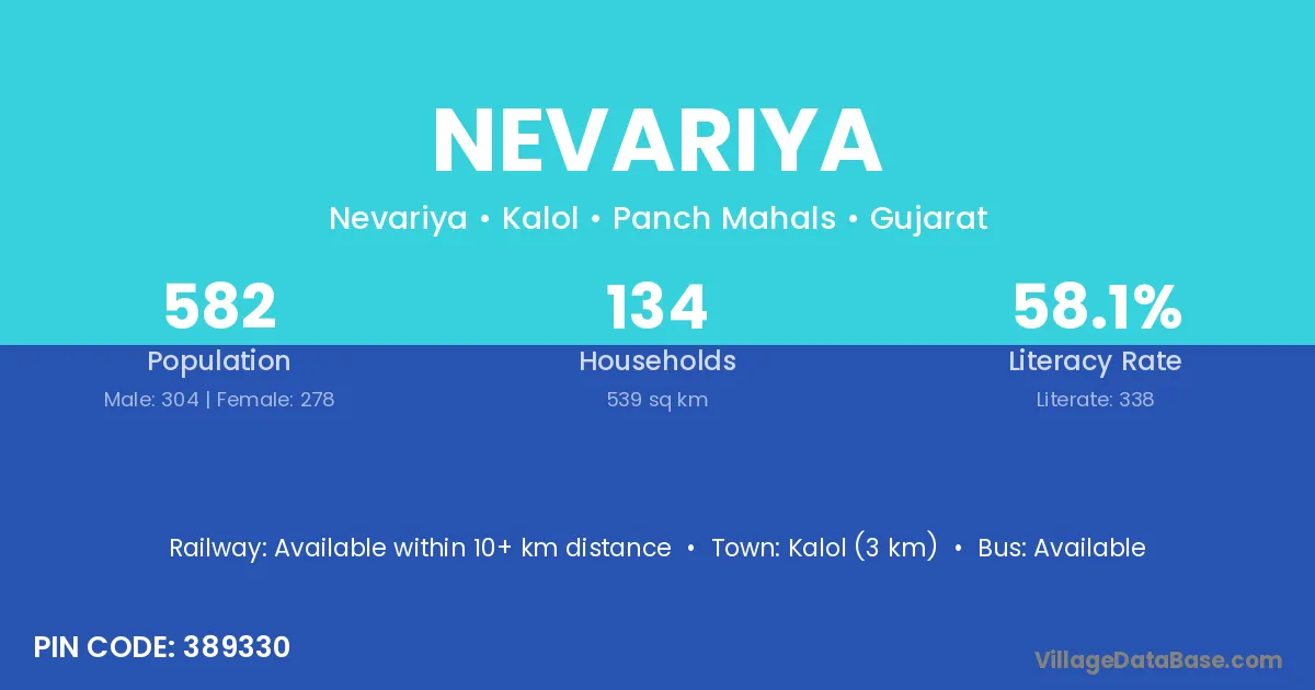 The literacy rate of Nevariya village is 59.58%. Male literacy stands at 70.13% and female literacy at 47.84%.