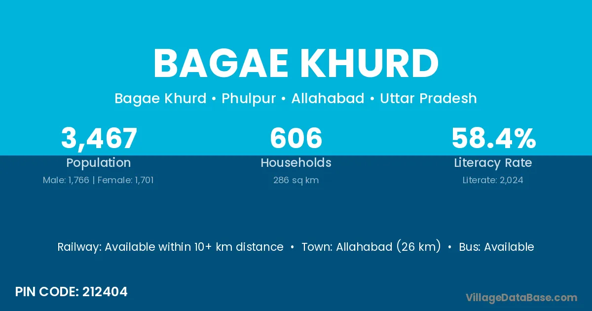 Allahabad (26 km) is the nearest town to Bagae Khurd village for major economic activities and is located approximately 26 km away.