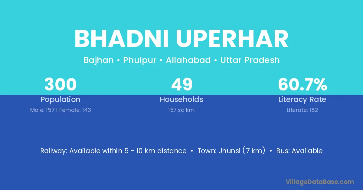 Jhunsi (7 km) is the nearest town to Bhadni Uperhar village for major economic activities and is located approximately 7 km away.