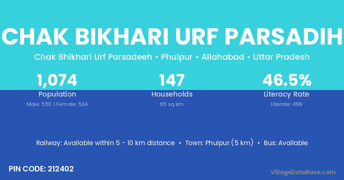 Phulpur (5 km) is the nearest town to Chak Bikhari Urf Parsadih village for major economic activities and is located approximately 5 km away.