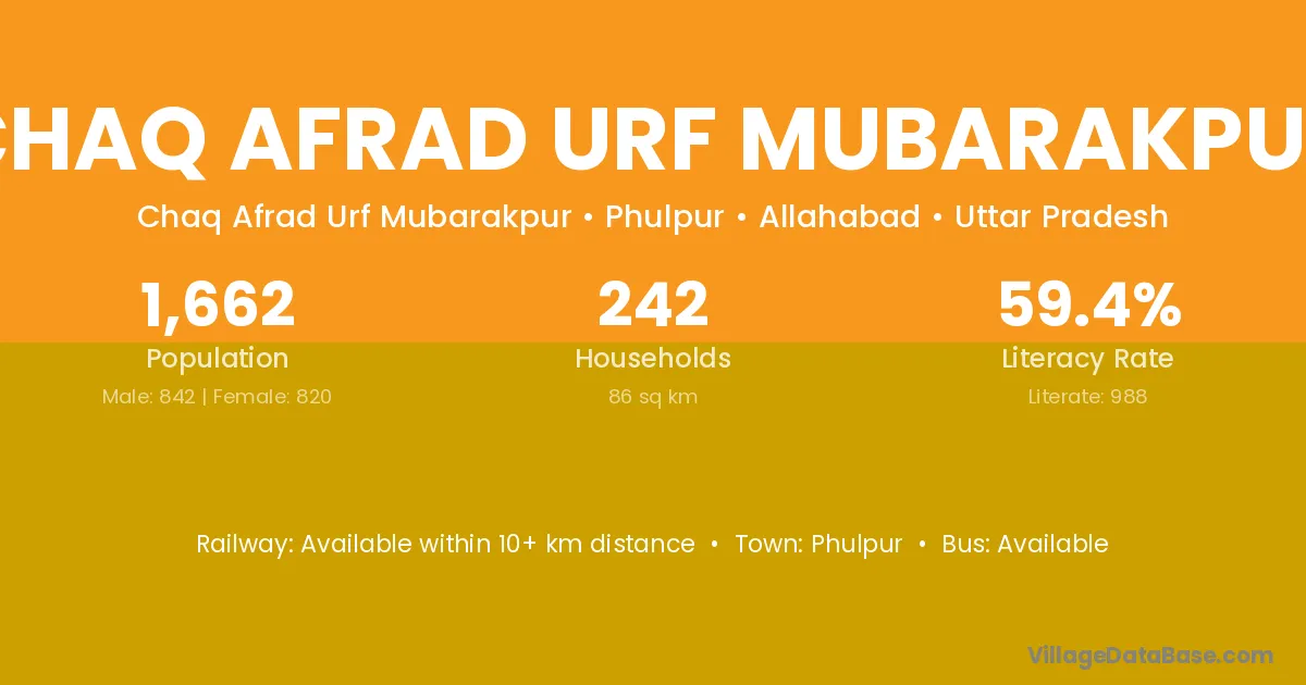 Chaq Afrad Urf Mubarakpur village has a total population of 1,662 people, of which 842 are males and 820 are females.