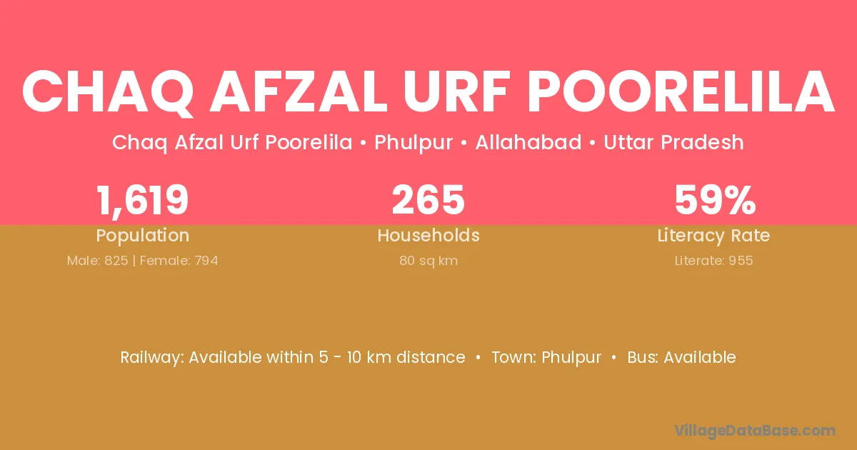 Chaq Afzal Urf Poorelila village has a total population of 1,619 people, of which 825 are males and 794 are females.