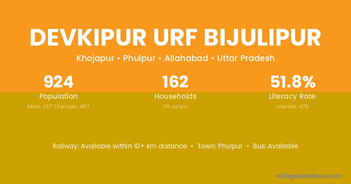 Devkipur Urf Bijulipur village has a total population of 924 people, of which 457 are males and 467 are females.