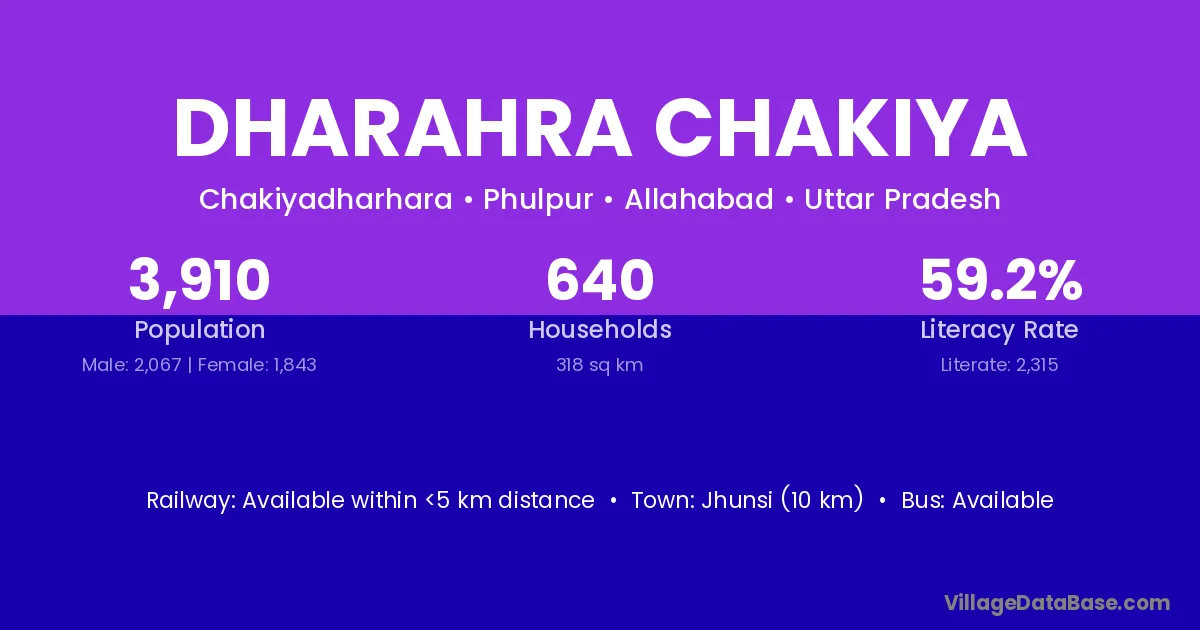 Jhunsi (10 km) is the nearest town to Dharahra Chakiya village for major economic activities and is located approximately 10 km away.