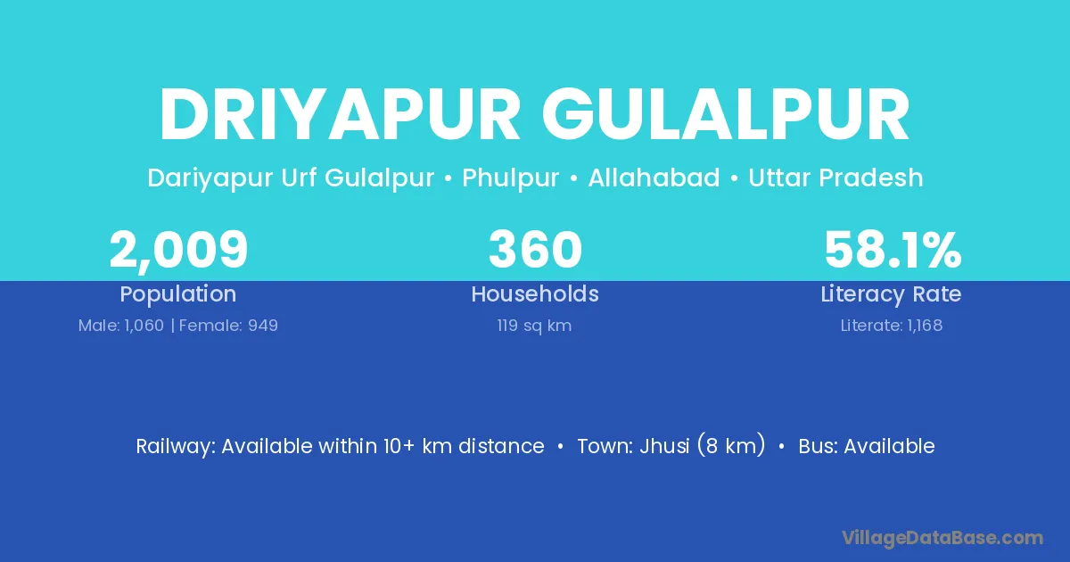 Jhusi (8 km) is the nearest town to Driyapur Gulalpur village for major economic activities and is located approximately 8 km away.