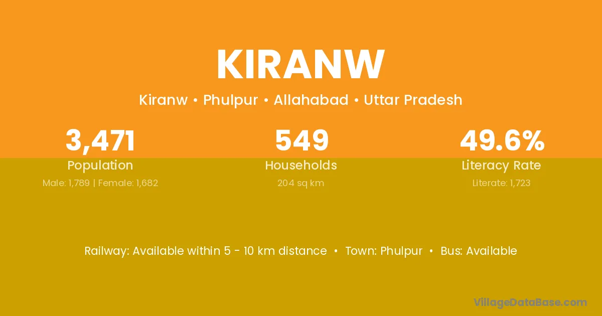 Kiranw village has a total population of 3,471 people, of which 1,789 are males and 1,682 are females.