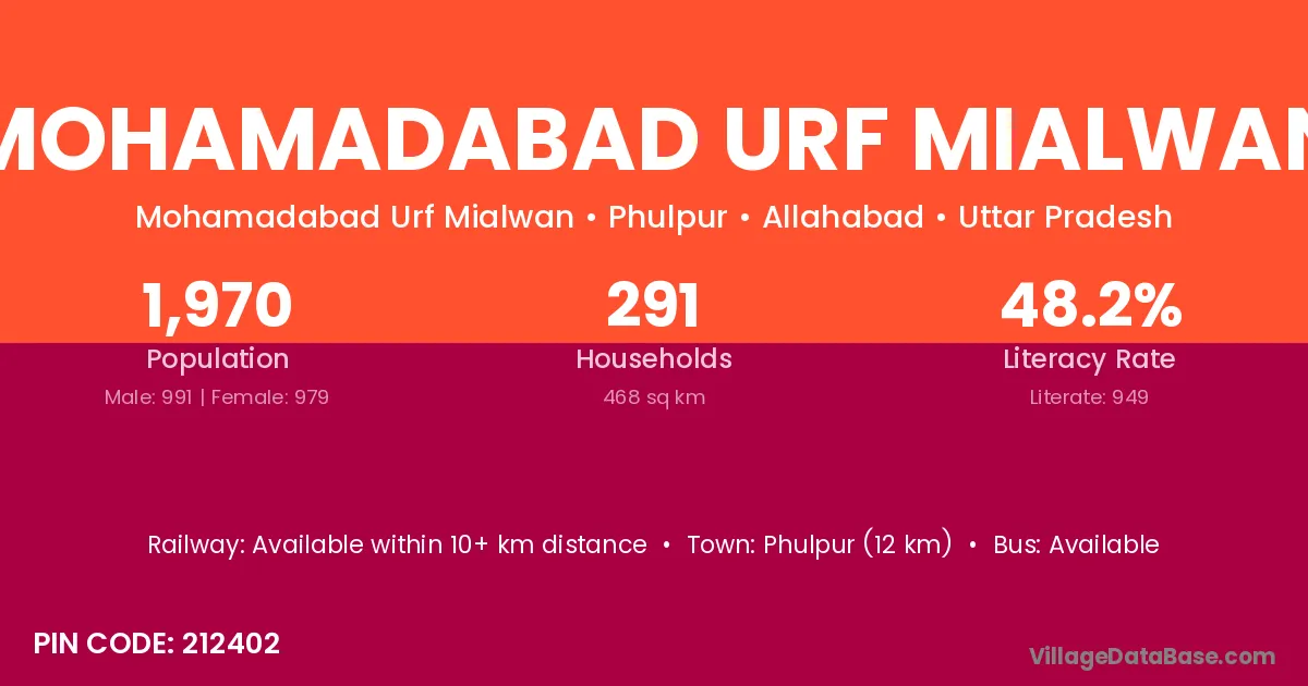 Phulpur (12 km) is the nearest town to Mohamadabad Urf Mialwan village for major economic activities and is located approximately 12 km away.