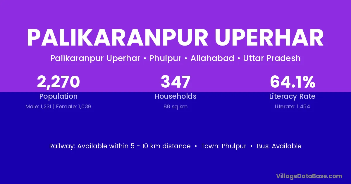 Palikaranpur Uperhar village has a total population of 2,270 people, of which 1,231 are males and 1,039 are females.