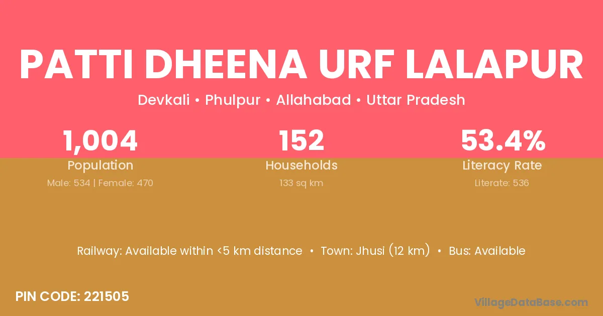 Patti Dheena Urf Lalapur village has a total population of 1,004 people, of which 534 are males and 470 are females.