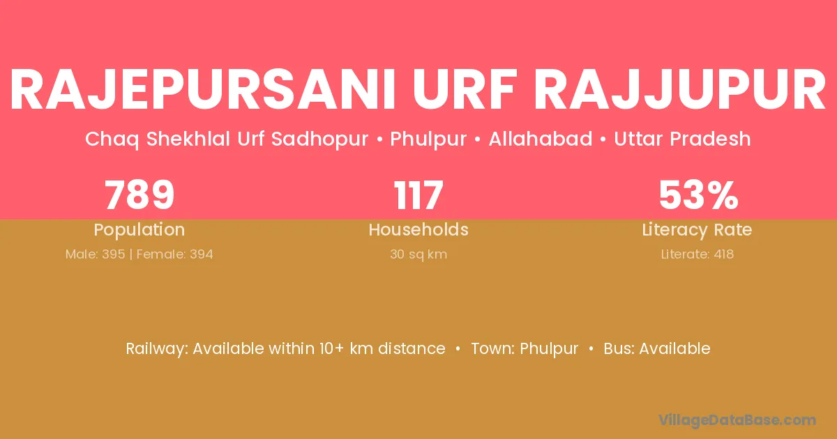 Rajepursani Urf Rajjupur village has a total population of 789 people, of which 395 are males and 394 are females.