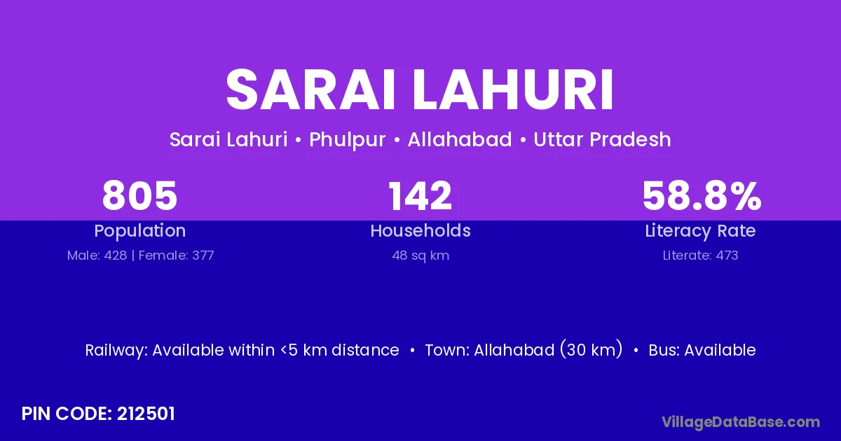 Allahabad (30 km) is the nearest town to Sarai Lahuri village for major economic activities and is located approximately 30 km away.
