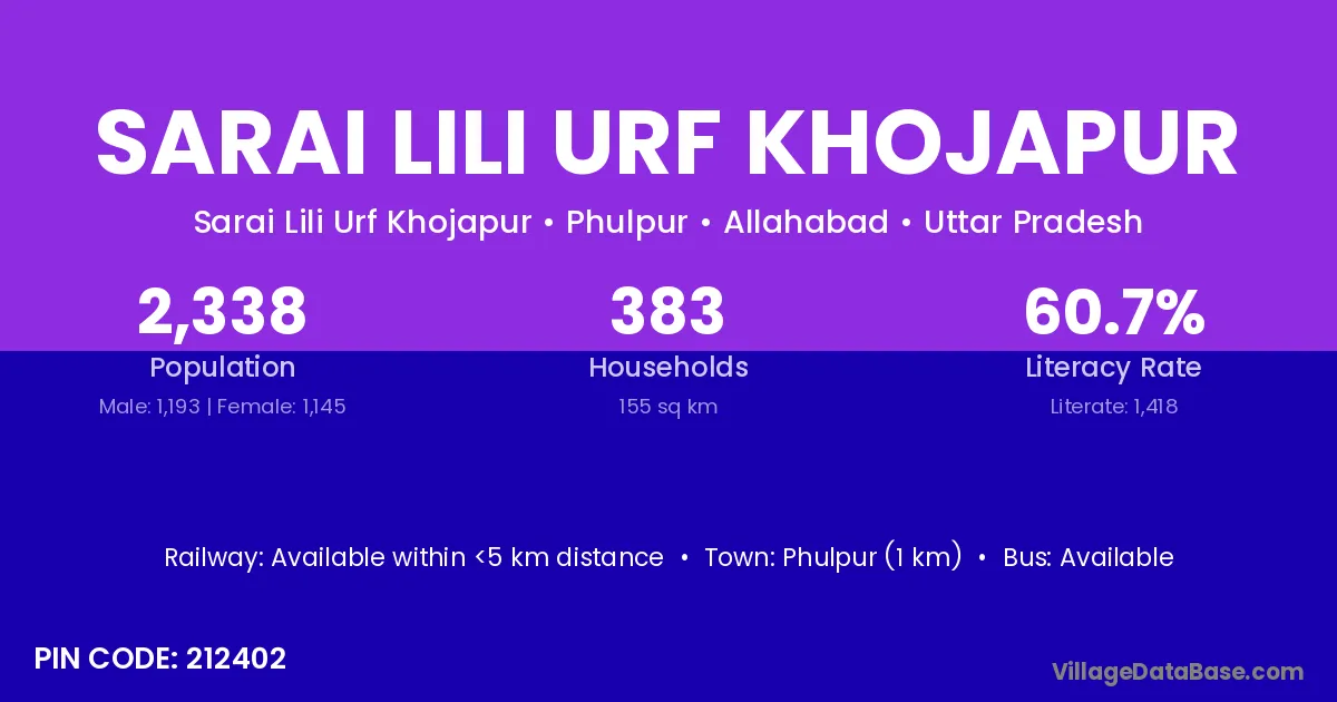 Phulpur (1 km) is the nearest town to Sarai Lili Urf Khojapur village for major economic activities and is located approximately 1 km away.