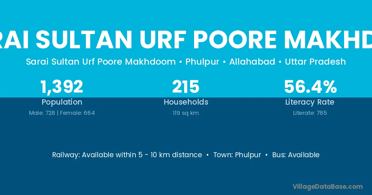 Sarai Sultan Urf Poore Makhdoo village has a total population of 1,392 people, of which 728 are males and 664 are females.