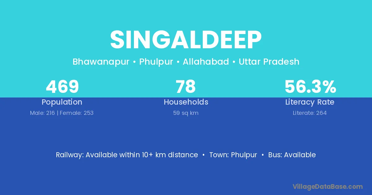 Singaldeep village has a total population of 469 people, of which 216 are males and 253 are females.