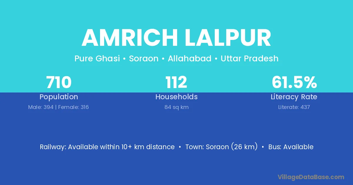 Soraon (26 km) is the nearest town to Amrich Lalpur village for major economic activities and is located approximately 26 km away.