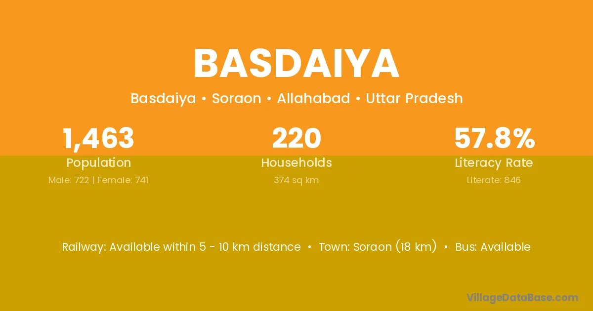 Soraon (18 km) is the nearest town to Basdaiya village for major economic activities and is located approximately 18 km away.