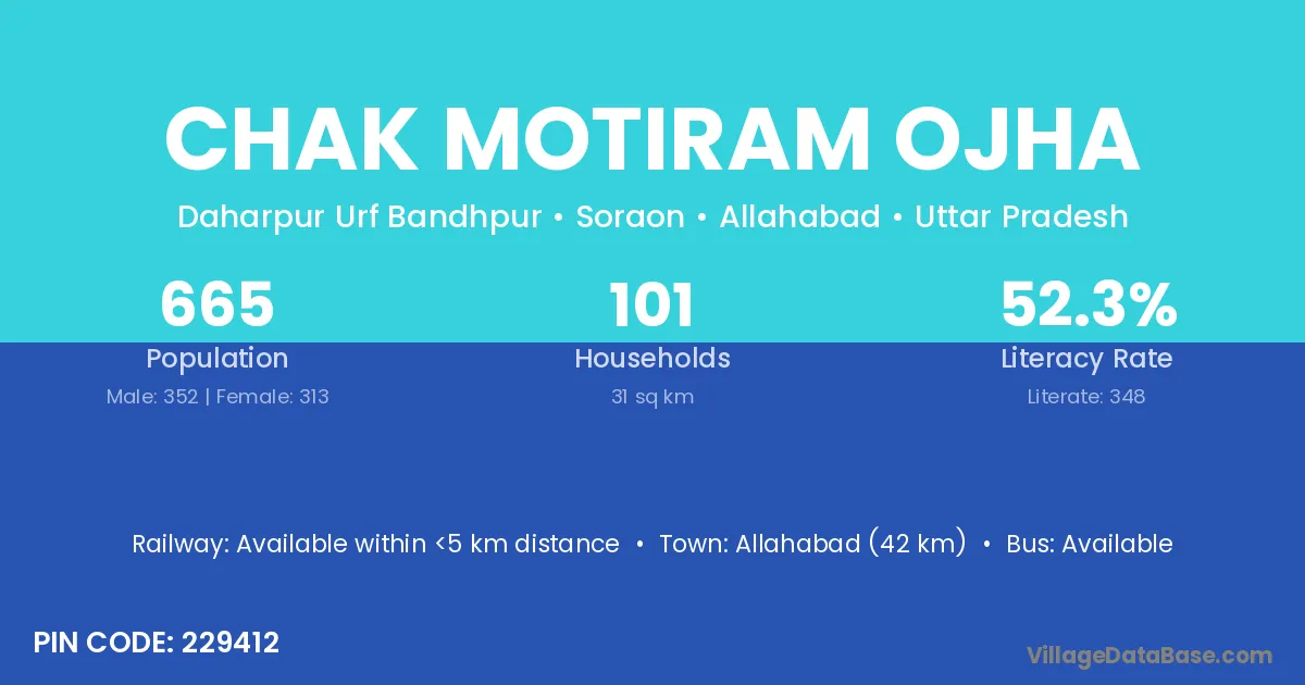 Allahabad (42 km) is the nearest town to Chak Motiram Ojha village for major economic activities and is located approximately 42 km away.