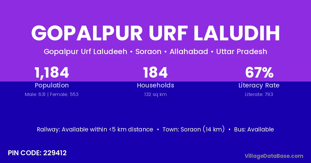 Soraon (14 km) is the nearest town to Gopalpur Urf Laludih village for major economic activities and is located approximately 14 km away.