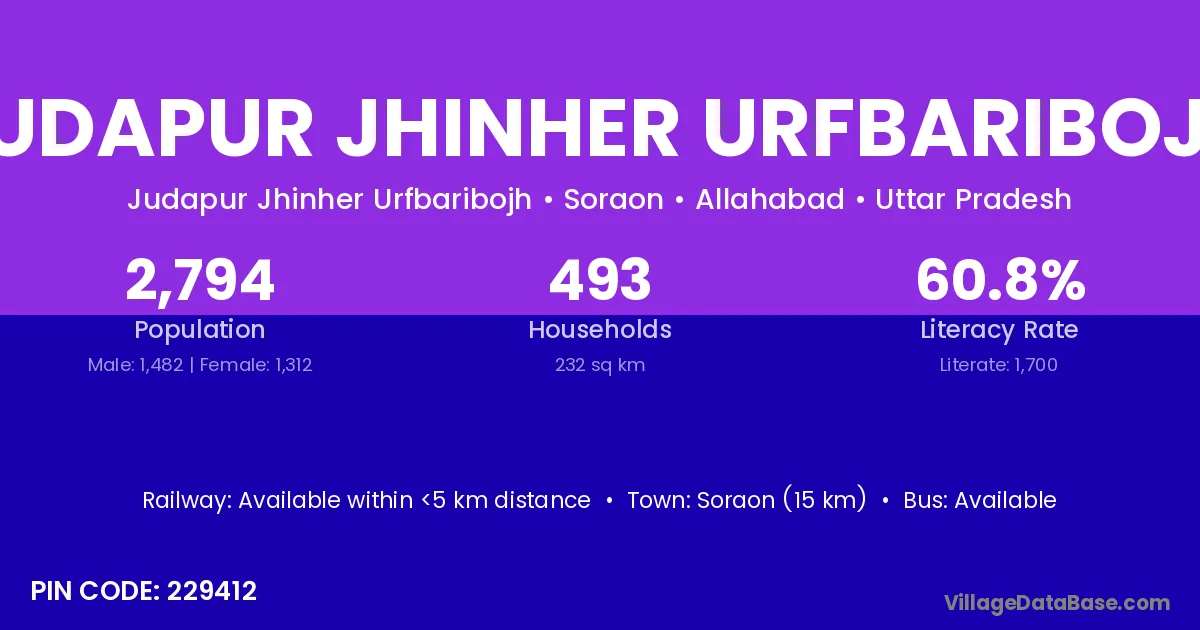 Soraon (15 km) is the nearest town to Judapur Jhinher Urfbaribojh village for major economic activities and is located approximately 15 km away.