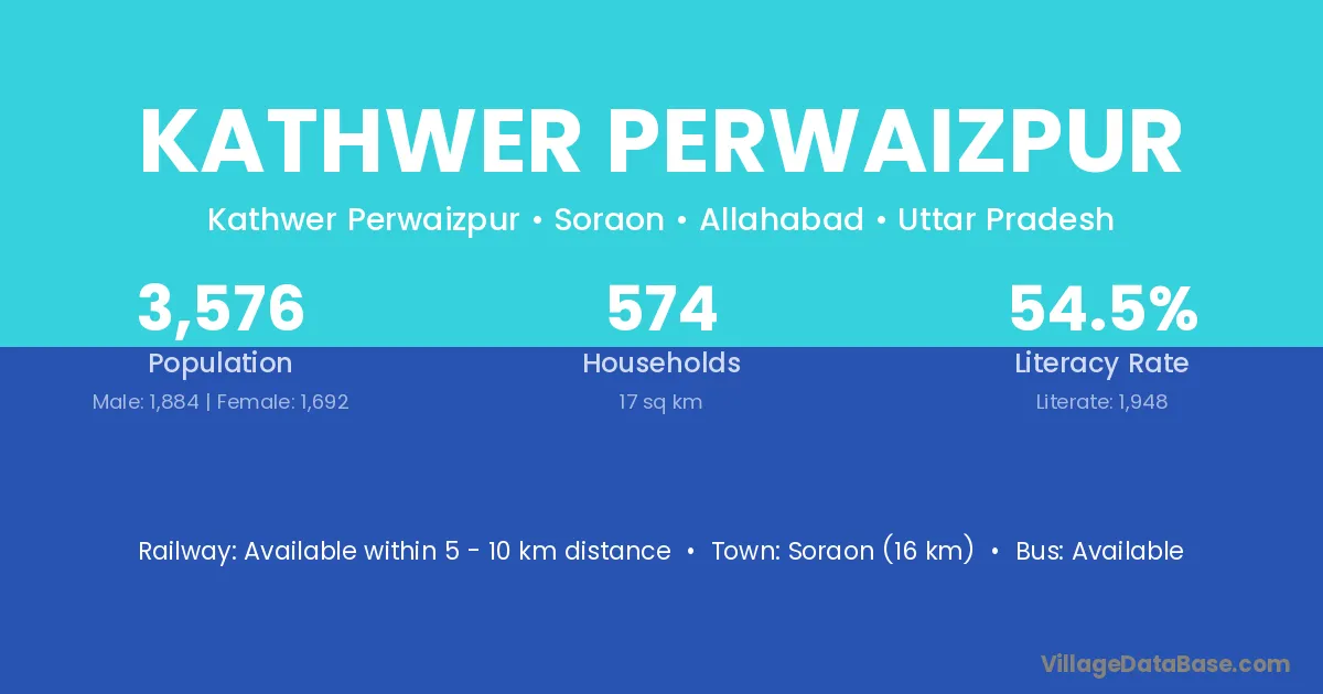 Soraon (16 km) is the nearest town to Kathwer Perwaizpur village for major economic activities and is located approximately 16 km away.