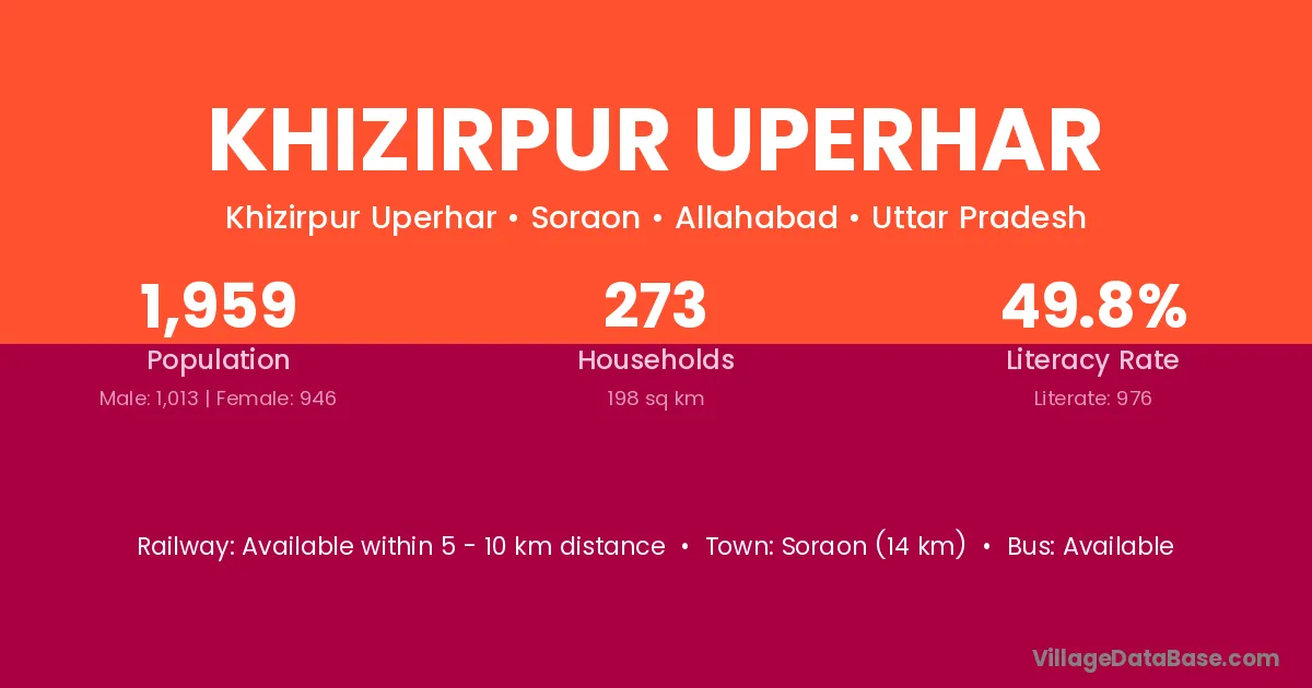 Soraon (14 km) is the nearest town to Khizirpur Uperhar village for major economic activities and is located approximately 14 km away.