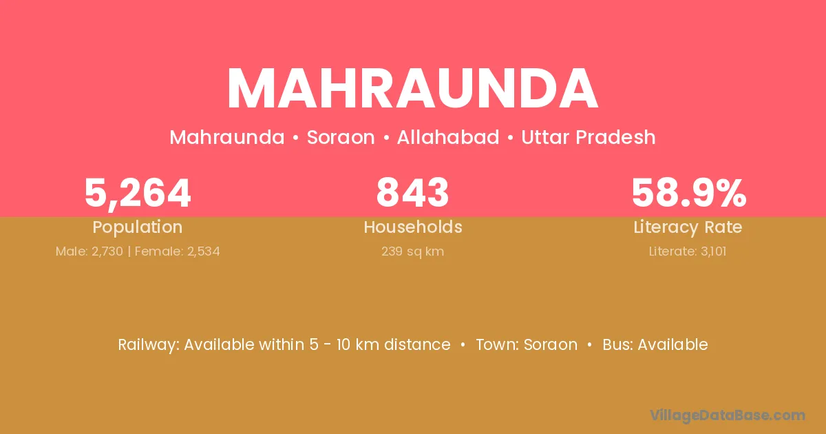 Mahraunda village has a total population of 5,264 people, of which 2,730 are males and 2,534 are females.