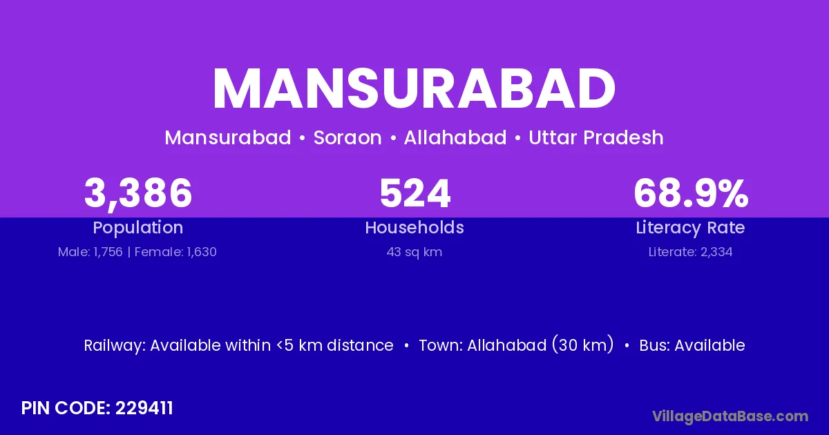 Allahabad (30 km) is the nearest town to Mansurabad village for major economic activities and is located approximately 30 km away.
