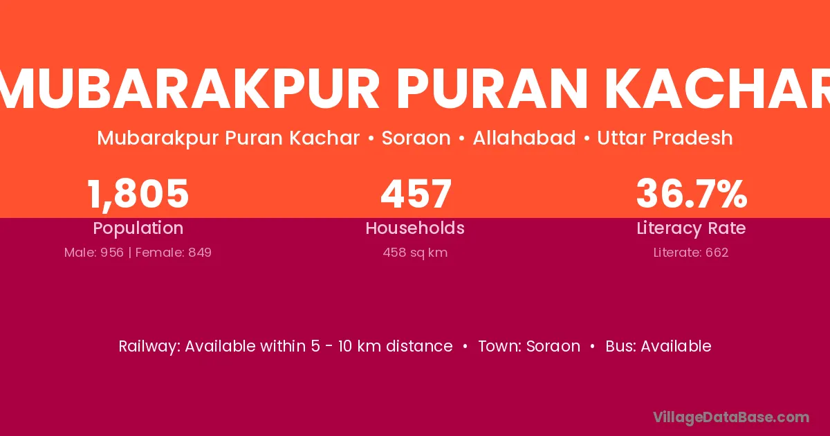 Mubarakpur Puran Kachar village has a total population of 1,805 people, of which 956 are males and 849 are females.