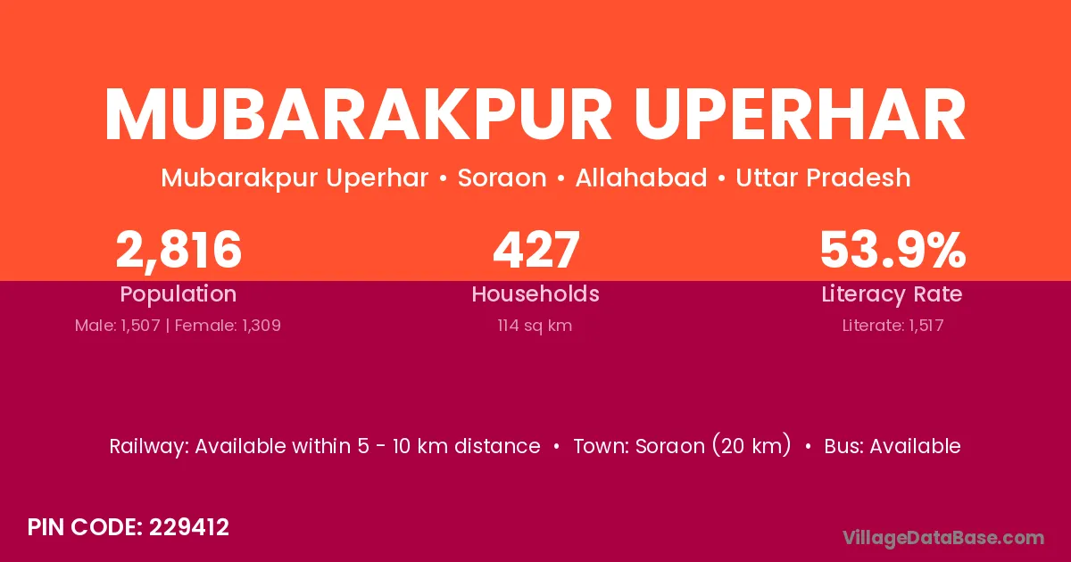 Soraon (20 km) is the nearest town to Mubarakpur Uperhar village for major economic activities and is located approximately 20 km away.