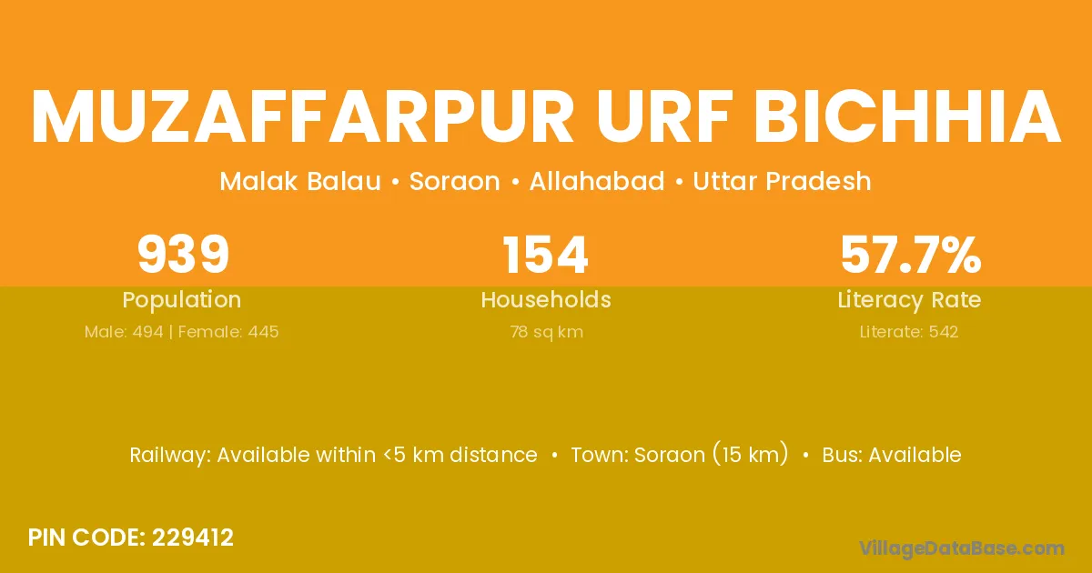 Muzaffarpur Urf Bichhia village has a total population of 939 people, of which 494 are males and 445 are females.
