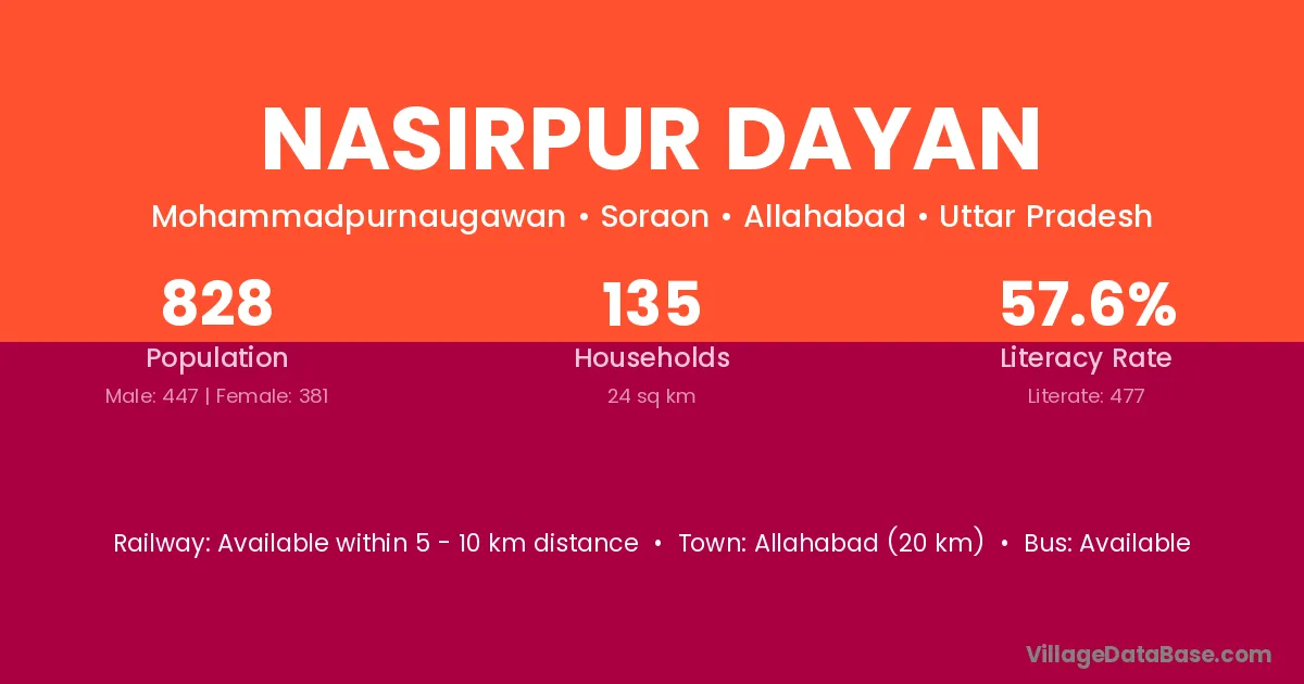 Allahabad (20 km) is the nearest town to Nasirpur Dayan village for major economic activities and is located approximately 20 km away.