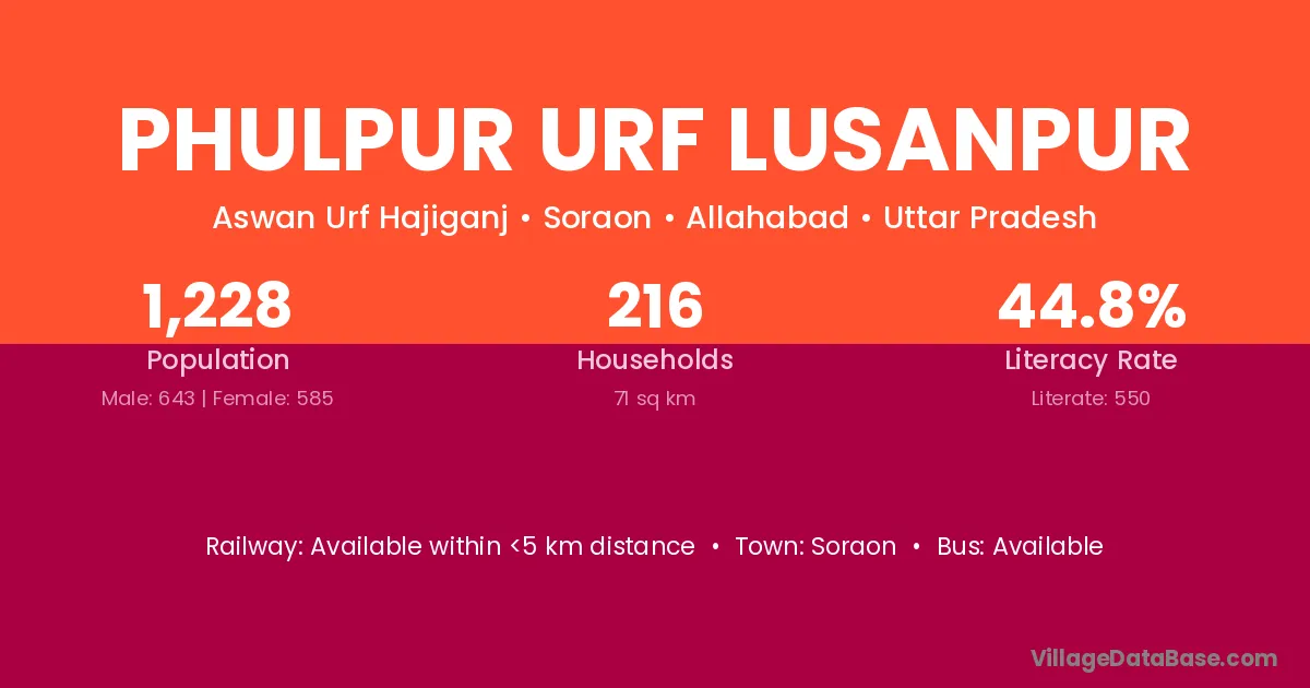 Phulpur Urf Lusanpur village has a total population of 1,228 people, of which 643 are males and 585 are females.