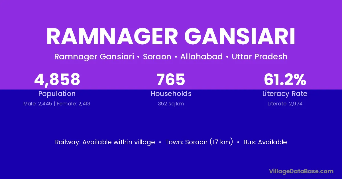 Soraon (17 km) is the nearest town to Ramnager Gansiari village for major economic activities and is located approximately 17 km away.