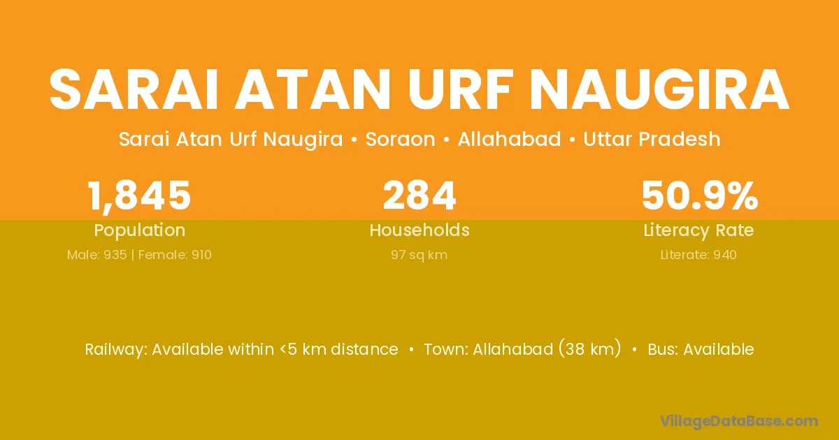 Sarai Atan Urf Naugira village has a total population of 1,845 people, of which 935 are males and 910 are females.