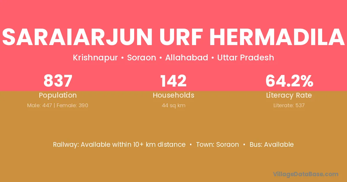 Saraiarjun Urf Hermadila village has a total population of 837 people, of which 447 are males and 390 are females.