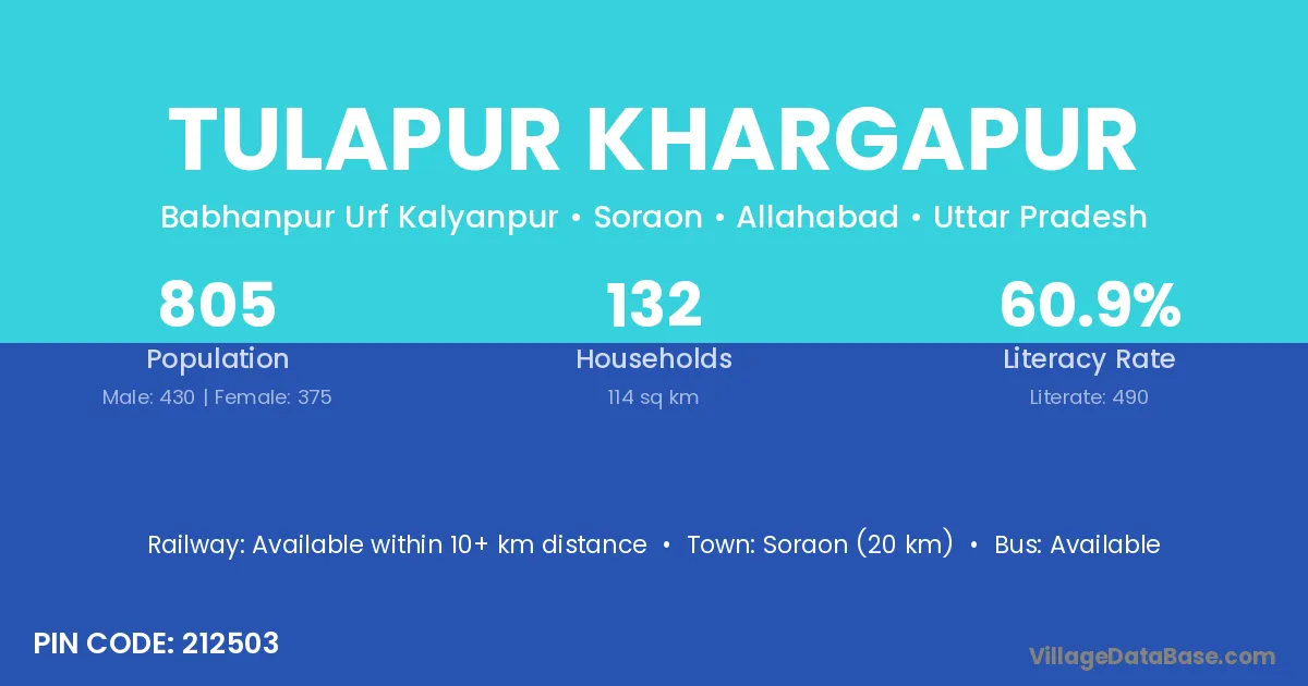 Soraon (20 km) is the nearest town to Tulapur Khargapur village for major economic activities and is located approximately 20 km away.