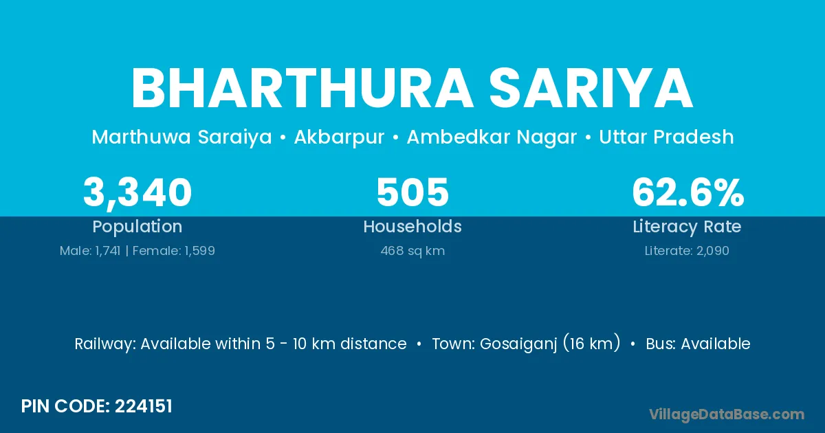 Gosaiganj (16 km) is the nearest town to Bharthura Sariya village for major economic activities and is located approximately 16 km away.