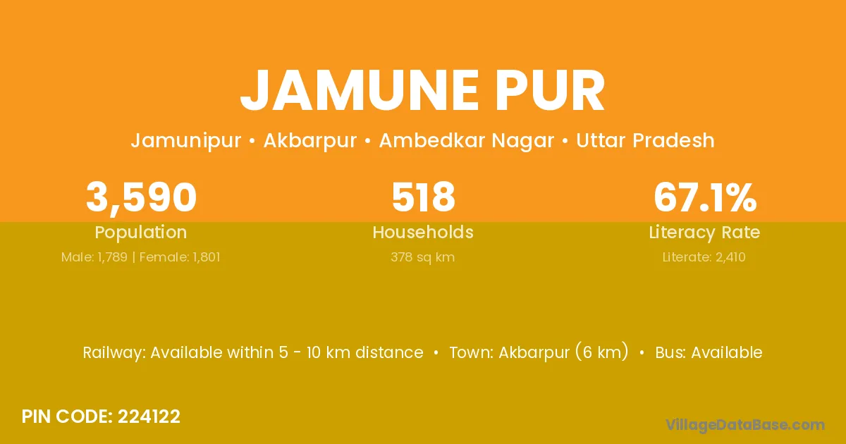 Akbarpur (6 km) is the nearest town to Jamune Pur village for major economic activities and is located approximately 6 km away.