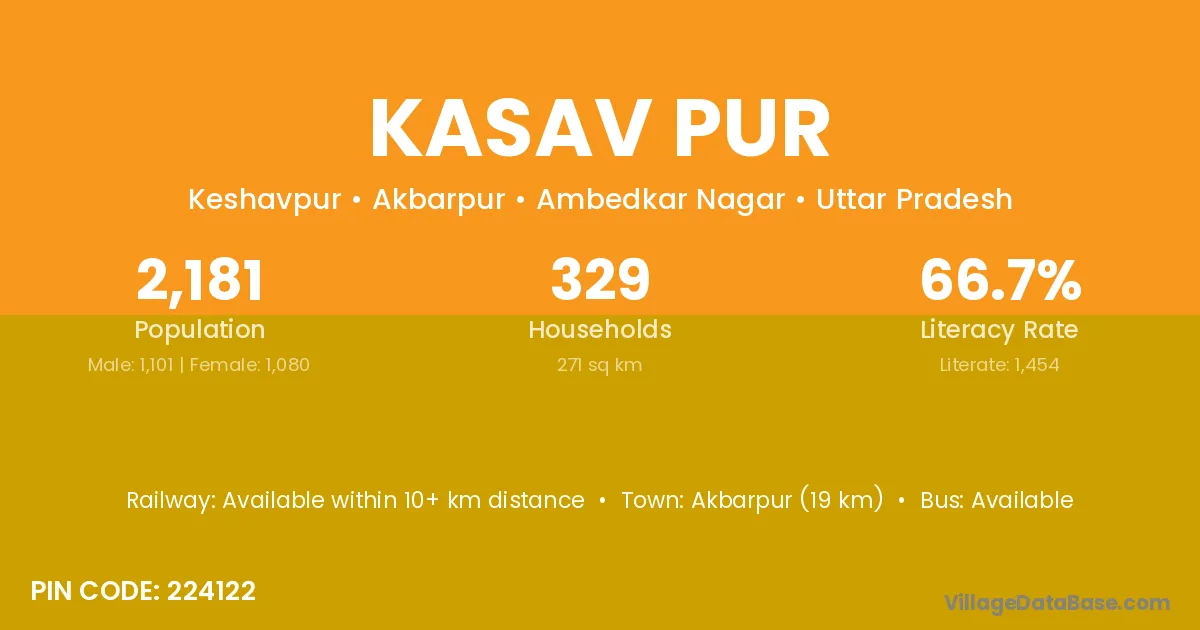 Akbarpur (19 km) is the nearest town to Kasav Pur village for major economic activities and is located approximately 19 km away.