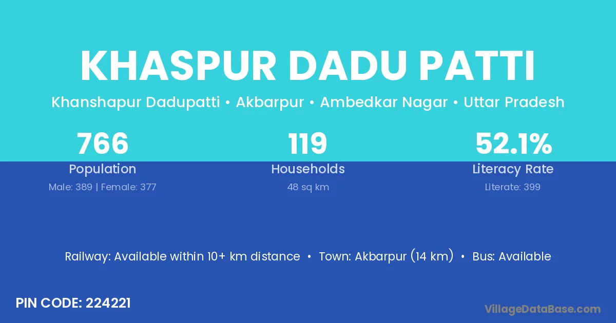 Akbarpur (14 km) is the nearest town to Khaspur Dadu Patti village for major economic activities and is located approximately 14 km away.