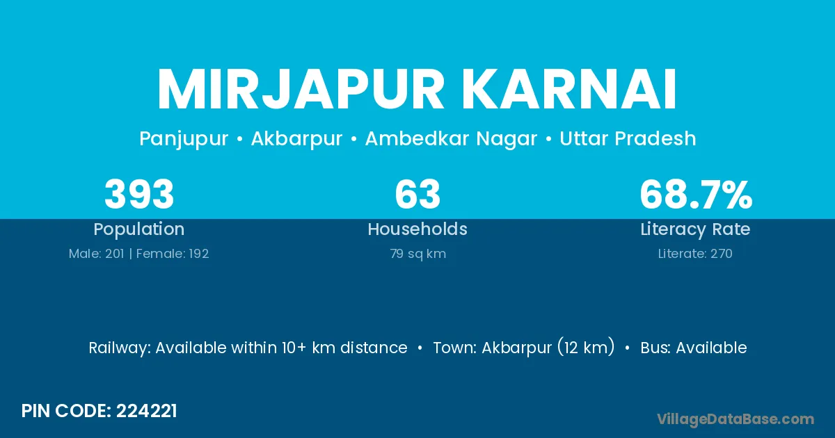 Akbarpur (12 km) is the nearest town to Mirjapur Karnai village for major economic activities and is located approximately 12 km away.