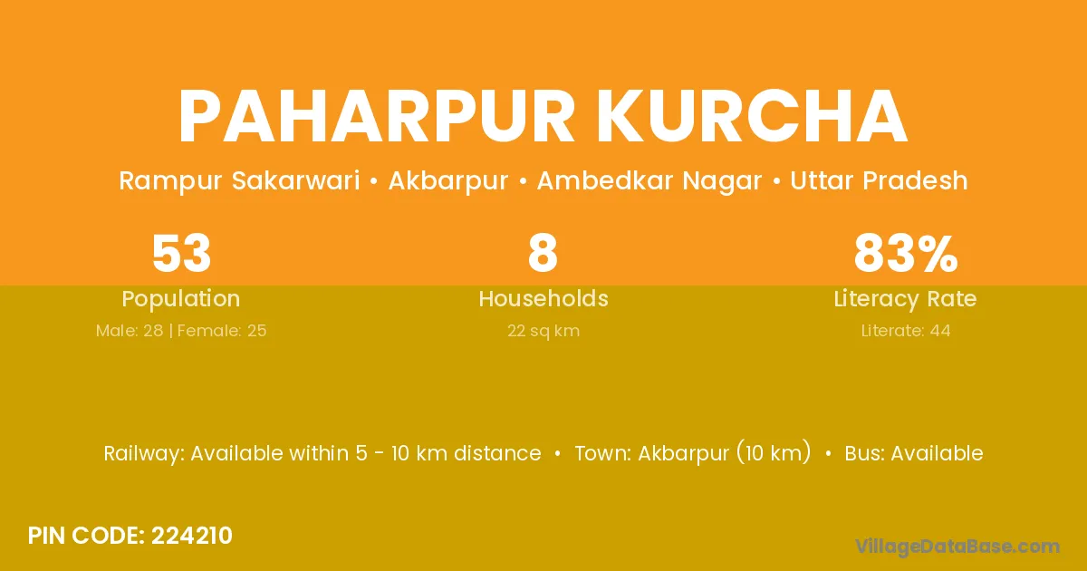 Akbarpur (10 km) is the nearest town to Paharpur Kurcha village for major economic activities and is located approximately 10 km away.