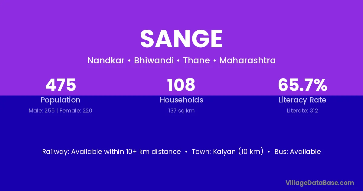 Sange village has a total population of 166 people, of which 83 are males and 83 are females.